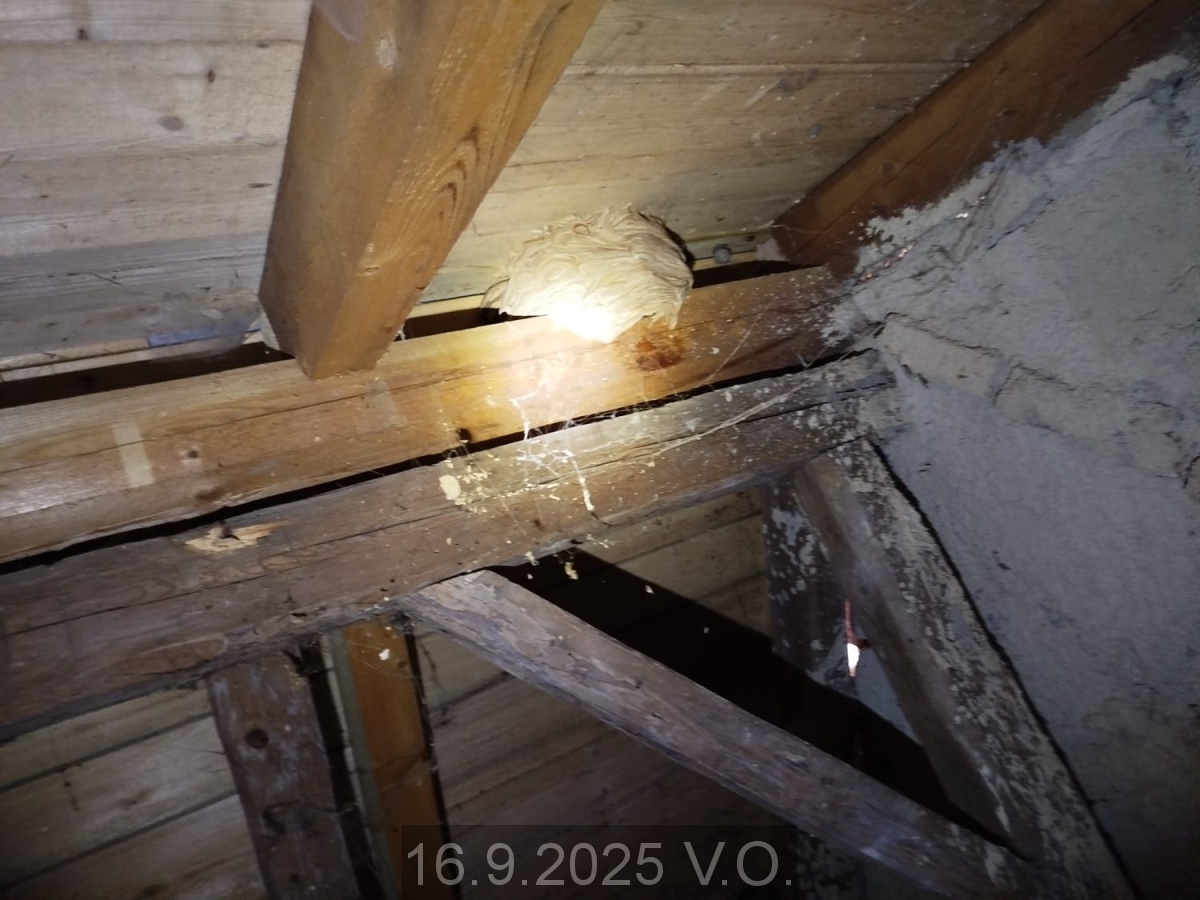 Velitel jednotky požádán o pomoc při zlikvidování sršního hnízda v místní části Velká Roudka. Informováno vedení města a KOPIS HZS JMK. Na PKV jednotka vyjíždí na adresu. Hasič vystrojen ve včelařské kukle provedl fyzickou likvidaci sršního hnízda v prostoru půdy rodinného domu. Následně místo postříkáno biologickým hubícím sprejem. Odjezd na základnu.
