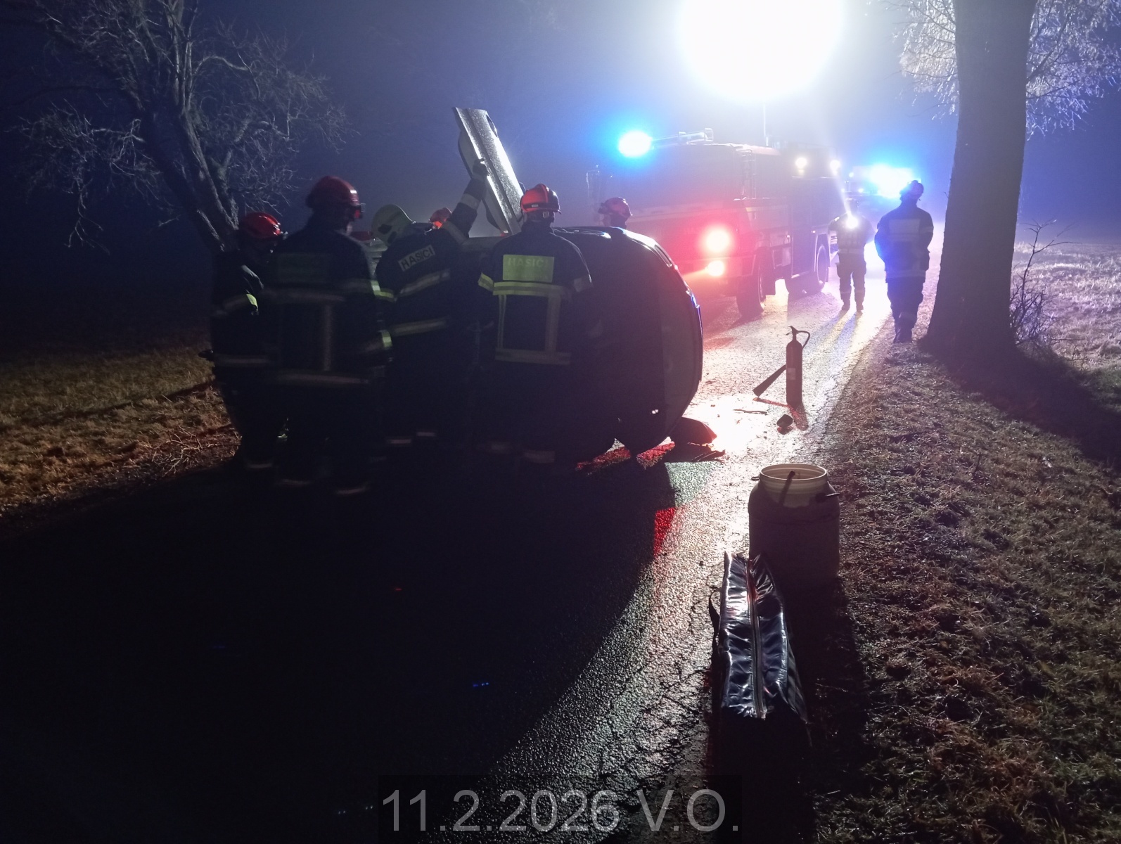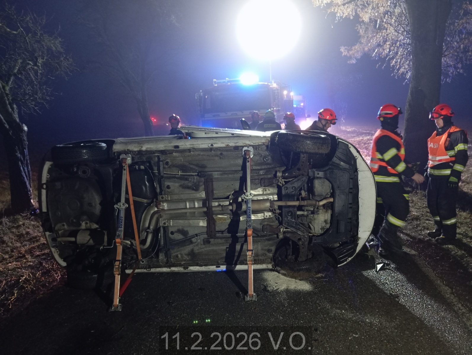 Jednotka vyjíždí na PKV KOPIS HZS JMK k dopravní nehodě se zraněním osoby na silnici Drválovice směr Kladoruby. Jedná se o osobní automobil Škoda Fabia jejíž řidička na kluzké silnici ztratila kontrolu nad vozem a havarovala do příkopu, následně do stromu a vůz se převrátil na levý bok přes celou šíři silnice. Při příjezdu řidička mimo automobil. Průzkum. Osvětlení místa zásahu osvětlovacím stožárem z 1V. Zraněná řidička v péči hasiče, kontrola případného poranění, poskytnut tepelný komfort v DA-VW do příjezdu ZZS, následné předání. Zasypán drobný únik PHM sorbentem. Za pomoci stabilizačních tyčí provedena stabilizace vozu. Příjezd HS Boskovice, předání místa zásahu VZ, postupováno dle jeho rozkazů. Provedeno PPO na vozidle. Dva hasiči odkláněli dopravu v místě uzavřené komunikace do vystřídání policií. Odjezd DA-VW na základnu, na místě zůstává 1V. Po dokumentaci nehody provedeno společné převrácení vozu na kola a odtlačení mimo silnici. Zasypán drobný únik PHM a košťaty úklid silnice. Odjezd na základnu.