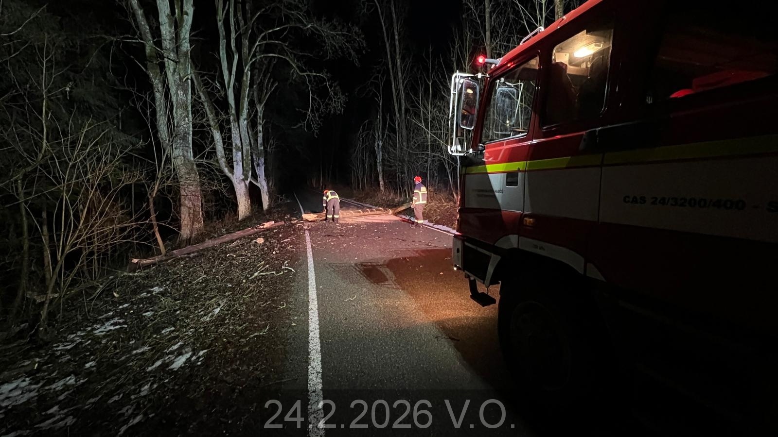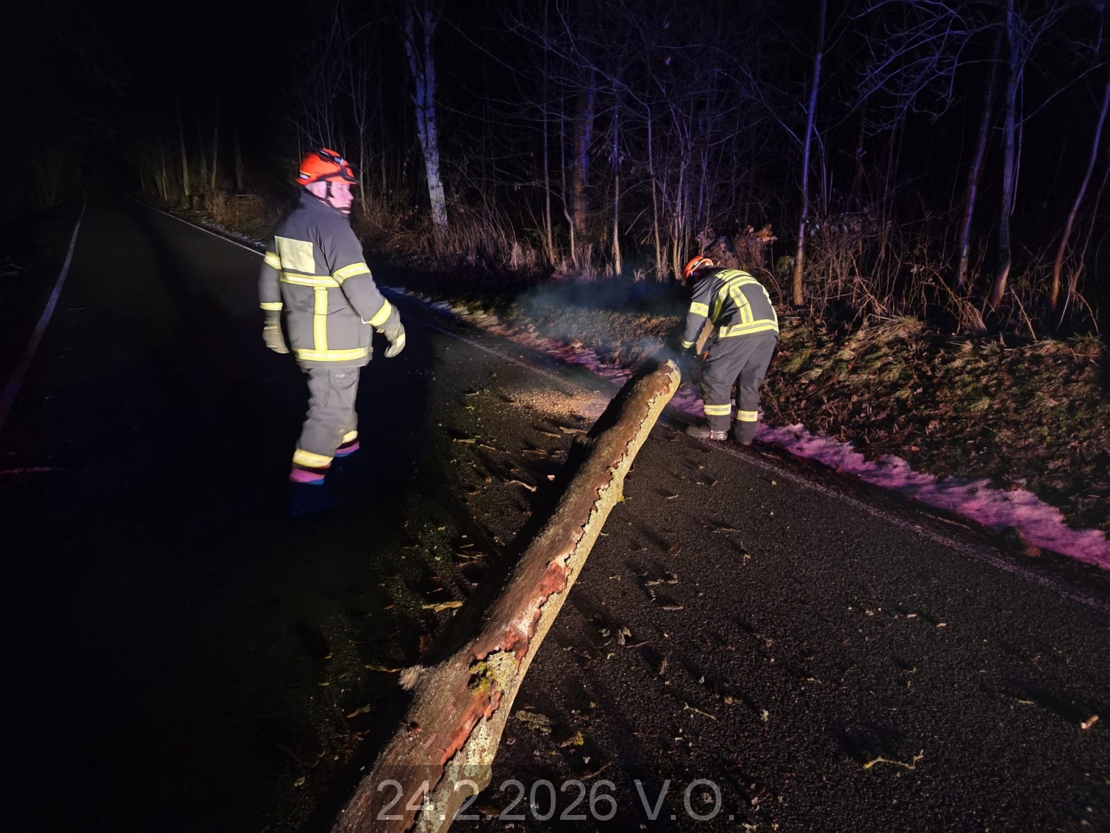 Jednotka vyjíždí na PKV KOPIS HZS JMK k odstranění stromu přes celou šíři silnice V.O. směr V.Roudka. Za pomoci motorové řetězové pily strom rozřezán, silnice očištěna, odjezd na základnu.