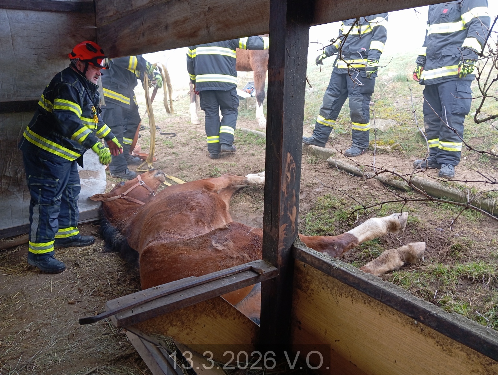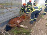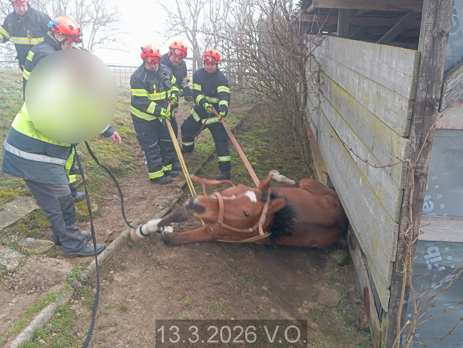 Jednotka vyjíždí na PKV KOPIS HZS JMK k záchraně koně, který není schopen se vlastními silami zvednout ze země. Na místě majitel koně. Jedná se o klisnu, která leží na levém boku neznámo jak dlouho vedle dřevěné boudy v menší příkopě. Průzkum. Ve spolupráci s majitelem koně snaha o podvlečení popruhu pod nohy a tělo s myšlenkou pomoci při zvednutí se na nohy. Bohužel po opakovaných pokusech se klisna neudrží na zadních nohách a opět padá. Následně jsme provedli odstranění několika dřevěných desek z obložení boudy, že klisně pomůžeme se převrátit na druhý bok. Opět pokus za pomoci úvazku při postavení se na nohy, ale převážně na zadních se neudrží a opět lehá. Příjezd HS Boskovice, předání místa zásahu. Po dohodě s VZ za použití dvou hadic "C" podvlečení pod tělem a nohami a postupováno dle jeho rozkazu. Při přesunu zadních noh na suchou hlínu se klisně daří se zapřít a sama vstává. Úklid použitých prostředků, odjezd na základnu.