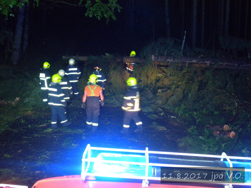 Jednotka vyjíždí na odstranění stromu přes silnici do obce Šebetov. Při příjezdu provedeným průzkumem zjištěno, že se událost nachází na silnici Šebetov směr Pohora. Jedná se o tři vzrostlé smrky, které jsou vyvrácené s kořeny, přes sebe ležící na celé šíři silnice. Osvětlení místa zásahu pomocí halogenů z T815 CAS 24 a za pomoci dvou motorových řetězových pil postupné odstranění stromů. Úklid odřezků a haluzí. Odjezd na základnu. Zúčastněné jednotky: JSDH Velké Opatovice.