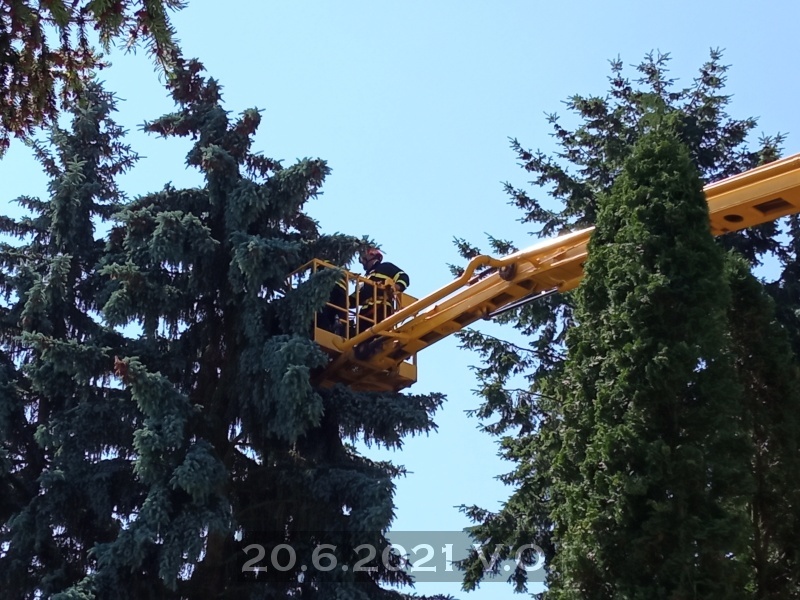 Jednotka vyjíždí na příkaz KOPIS HZS JMK na žádost školníka základní školy v obci Velké Opatovice k odstranění nebezpečně nalomeného smrku v areálu hřiště školy. Při příjezdu na místě oznamovatel. Proveden průzkum. Ustavení techniky. Jedná se o ulomenou špičku vzrostlého smrku, která by mohla ohrozit pohyb dětí na školním hřišti. Za pomoci AP27 a MŘP provedeno bezpečné ořezání vršku stromu. Úklid ořezu ze stromu z cesty. Úklid techniky a odjezd na základnu. Zúčastněné jednotky: JSDH Velké Opatovice.