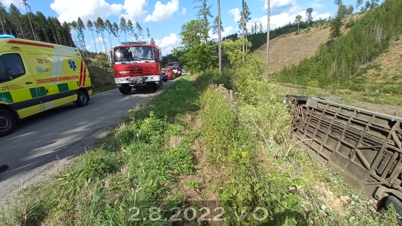 Jednotka vyjíždí na příkaz KOPIS HZS JMK k dopravní nehodě autobusu s vyproštěním osob na silnici Velké Opatovice směr Velká Roudka. Průzkum. Při příjezdu na místo zásahu, zjištěn linkový autobus, který havaroval sjetím do příkopu a převrátil se na pravý bok. Od civilních osob, které se pohybovali v okolí místa nehody, zjištěno, že ve voze jsou tři lidé, zranění, při vědomí. Okamžitá stabilizace autobusu automobilovým navijákem z T815 CAS24. Z vozu nyní neunikaly žádné PHM. Provedeno PPO. Dva cestující (žena a muž) byli zranění lehce a proto hasiči pomohli s vystoupením z autobusu střešním ventilačním oknem. Posazeni na krajnici silnice a dohoda s civilními osobami že je pohlídají do příjezdu ZZS. Za střechu autobusu ustaveny stabilizační tyče proti svahu. Řidič autobusu ležící na zádech v prostoru kabiny. Fixace krční páteře krčním límcem. Naložen na páteřní desku. Příjezd RZP Velké Opatovice. Za spolupráce se záchranářem je řidič na páteřní desce střešním ventilačním oknem vyproštěn ven a transportován k sanitnímu vozu. Příjezd PS Boskovice, předání místa zásahu. Příjezd RLP Boskovice, pomoc s transportem řidiče do vakuové matrace a do vozu ZZS. Dle instrukcí VZ dále prováděna činnost. Příjezd RZP Moravská Třebová, PS Blansko, Dopravní policie, LZS Hradec Králové, PS Lidická, tiskový mluvčí, inspektorát vedení od autobusu. Po odjezdu všech složek ZZS prováděno ve spolupráci s profesionálními hasiči vyčištění prostoru svahu od dřevin aby bylo možné těžkou technikou provést vytažení autobusu zpět na silnici. Po dokumentaci nehody dopravní policií a vytažení havarovaného busu provedla jednotka uklizení vysypaných věcí z busu ze svahu do pytlů. Po dohodě s VZ odjezd na základnu.