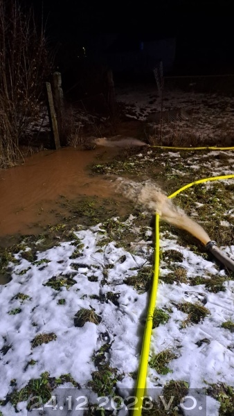 Jednotka vyjíždí na příkaz KOPIS HZS JMK k čerpání vody z laguny, která hrozí přetečením do sklepních prostor rodinného domu. Na místě oznamovatelka a obyvatelka domu. Průzkum. Osvětlení místa zásahu halogeny. Nasazena dvě plovoucí motorová čerpadla na přečerpávání vodní laguny přes silnici ze vzniklé, stále přitékající vody z polí. Pomoc obyvatelům domu s pytlováním písku do pytlů a usazování na usměrnění přetékající vody. Vyčištěna vodní vpusť u silnice. Po usměrnění přitékající vody a eliminace ohrožení zaplavení sklepa, ukončení čerpání vody čerpadly a odjezd na základnu.