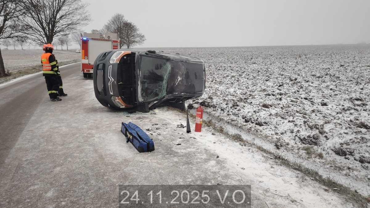 Jednotka vyjíždí na PKV KOPIS HZS JMK k dopravní nehodě os.automobilu na silnici V.O. směr Cetkovice se zraněním osob. Průzkum. Osoby z havarovaného vozidla mimo, sedící v teple projíždějícího vozu. Hasič poskytl předlékařskou péči, vyšetření a předání ZZS. Vozidlo bez úniku PHM. Provedeno protipožární opatření, stabilizace vozu tyčemi. Příjezd HS Boskovice, předání místa zásahu. Postupováno dle instrukcí VZ. Po dokumentaci nehody dopravní policí provedeno za pomoci automobilového navijáku převrácení vozu na kola a následně odtlačení mimo silnici. Během zásahu provedeno řízení provozu v místě zásahu. Společný úklid silnice a odjezd na základnu.