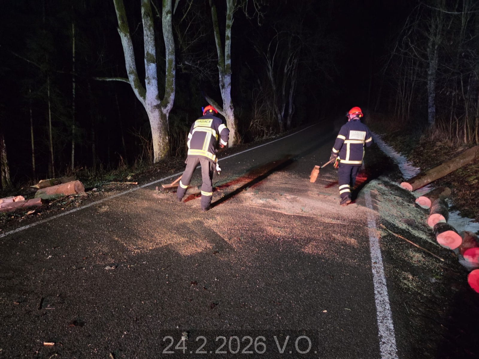 Jednotka vyjíždí na PKV KOPIS HZS JMK k odstranění stromu přes celou šíři silnice V.O. směr V.Roudka. Za pomoci motorové řetězové pily strom rozřezán, silnice očištěna, odjezd na základnu.